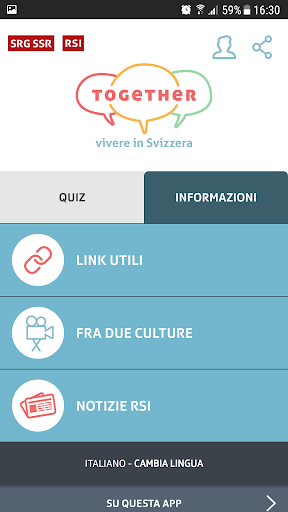 Metti alla prova le tue conoscenze sulla Svizzera e gioca con la famiglia e con gli amici! Ti aspettano domande costantemente aggiornate su tanti argomenti interessanti. Inviaci subito le tue proposte di domande per il quiz . E non è finita qui: non solo puoi giocare con ‹together› in tedesco, ma lo puoi fare addirittura anche in altre sei lingue, ovvero inglese, arabo, portoghese, spagnolo, francese e italiano.