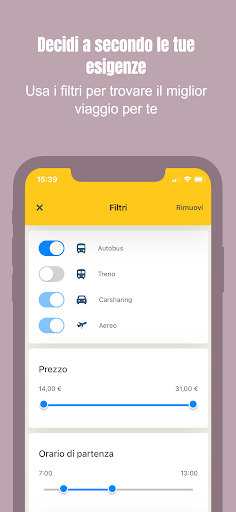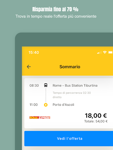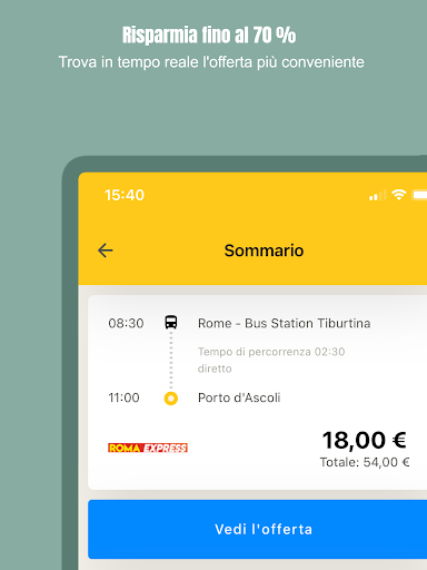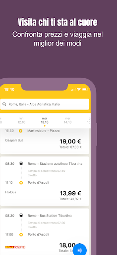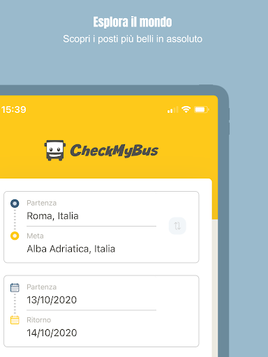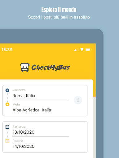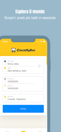 Con CheckMyBus trovi i viaggi più convenienti in tutto il mondo: metti a confronto autobus, treni, voli e car-sharing, tutto con una sola app. In un colpo solo puoi vedere i prezzi, gli orari di partenza e arrivo, la durata del viaggio, gli indirizzi delle fermate nonché tutte le informazioni sui servizi a bordo disponibili.