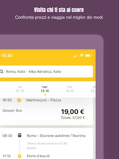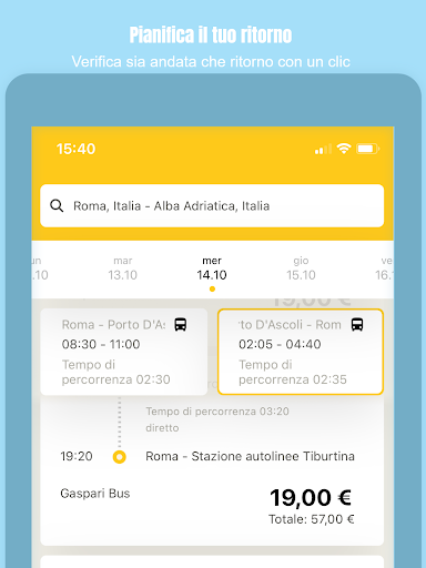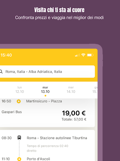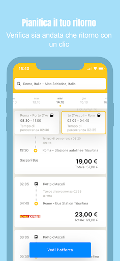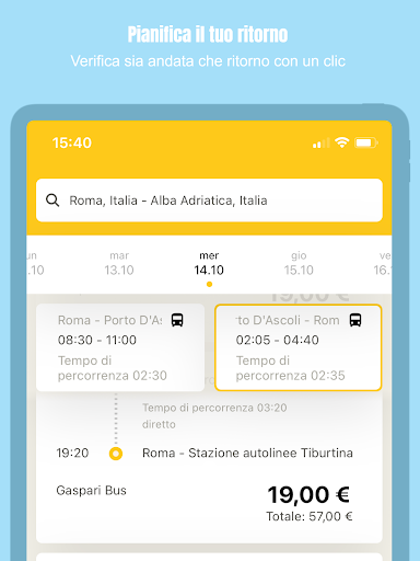 Aggiungi anche la data di ritorno e ordina i risultati direttamente a seconda delle tue esigenze per orario, prezzo, azienda d’autobus o durata.