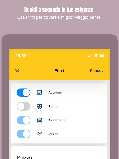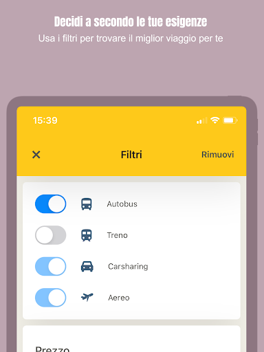 Metti a confronto i prezzi delle compagnie d’autobus con le tariffe per un viaggio in treno, in aereo o con car-sharing, tutto in una sola ricerca.