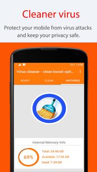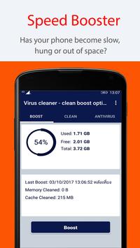 Virus cleaner - clean boost optimize 2018 is a small yet effective booster and cleaner app for Android. With intuitive interface, it can clean junk file, cache, ads, unnecessary background apps and boost mobile memory to make your phone faster. Even Android phones with slow processor and low memory can have a better performance after clean and boost.