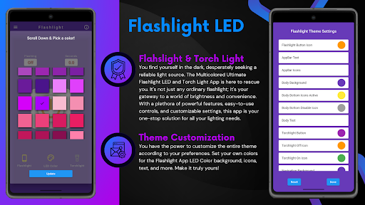 You have the power to customize the entire theme according to your preferences. Set your own colors for the Flashlight App LED Color background, icons, text, and more. Make it truly yours!