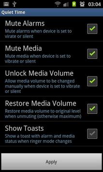 Pesky alarms going off when your phone is set to 'silent' or 'vibrate'? Some devices don't have the option to mute alarms when your device is set to silent or vibrate. This simple application will fix that. It's perfect for people who want silent mode to be truly silent. Just run the app once to choose and apply your settings.
