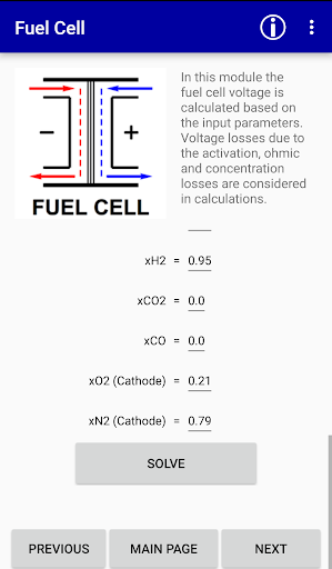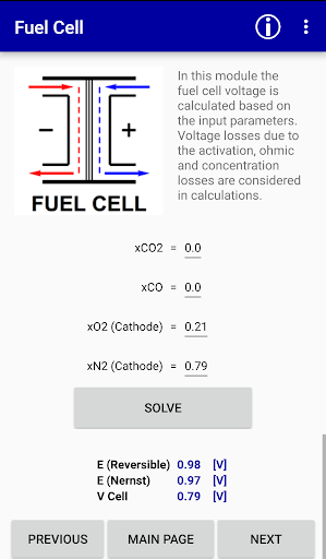 All modules are accessible from the ‘MAIN PAGE’ of the app and can be used independently. For example, in the ‘fuel processor’ module temperature of the reformer is an input parameter and the module calculates the reformate outlet gas compositions.