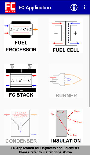 It is assumed that users have a reasonable knowledge and understanding of thermodynamics, fuel cells and the related logic applied to the systems behind the app. All responsibility for judgement of accuracy and correctness of results and outputs obtained from the app resides solely with the user, and he/she may wish to validate results against experimental data. Since there are some approximations in the obtained results, the ‘FC Application’ team strongly recommends that users validate results against their own applications.