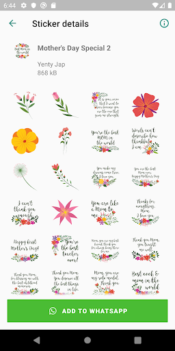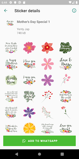 Buona festa della mamma, questo pacchetto adesivi di whatsapp è pieno con i messaggi grati per tua madre o qualcuno che è sempre stato una mamma per te, rendi il tuo messaggio di testo più personale oggi, crea quei sorriso sul tuo volto del ricevitore che non dimenticheranno mai e afferrano mai la loro attenzione.