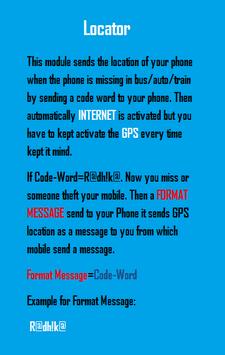 This module sends the location of your phone when the phone is missing in bus/auto/train by sending a code word to your phone. Then automatically INTERNET is activated but you have to kept activate the GPS every time kept it mind.