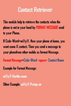 If Code-Word=m@y@. Now your phone at home, you want some X contact. Then you send a message to your phone from other mobile as format Message.