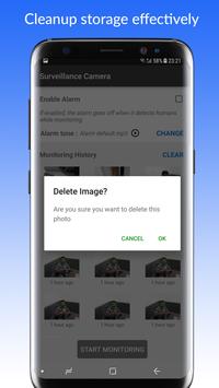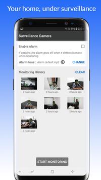 It can be configured to detect human presence and if found it will make an alarm right away or it will save the screenshot for later use.