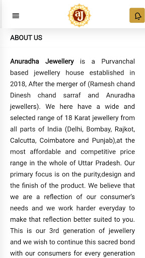 I gioielli Anuradha sono una casa di gioielli a base di Purtanchal stabilita nel 2018, dopo la fusione di (Ramesh Chand Dinesh Chand Saraff e gioiellieri Anuradha).Qui abbiamo una gamma ampia e selezionata di 18 karat gioielli da tutte le parti dell'India (Delhi, Bombay, Rajkot, Calcutta, Coimbatore e Punjab), alla fascia di prezzo più conveniente e competitiva in tutta l'Uttar Pradesh.Il nostro obiettivo principale è sulla purezza, il design e la finitura del prodotto.Riteniamo che siamo un riflesso dei bisogni dei nostri consumatori e lavoriamo più duramente ogni giorno per rendere quella riflessione più adatta a te.Questa è la nostra terza generazione di gioielli e desideriamo continuare questo sacro legame con i nostri consumatori per ogni generazione a venire.