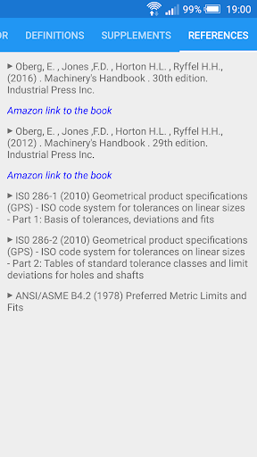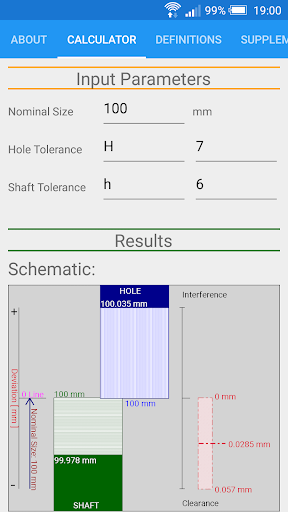 La calcolatrice funziona in linea con gli standard ISO 286-1 (2010), ISO 286-2 (2010) e ANSI B4.2 (1978) basati su unità metriche.Secondo i parametri di input delle dimensioni nominali e le tolleranze del foro / dell'albero, i limiti delle dimensioni e le deviazioni per il foro / albero sono calcolati e il tipo di adattamento è selezionato tra il gioco, la transizione e gli interferenze.