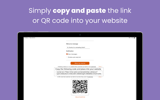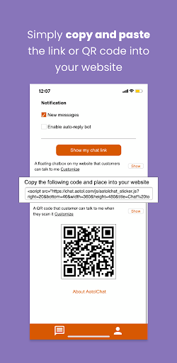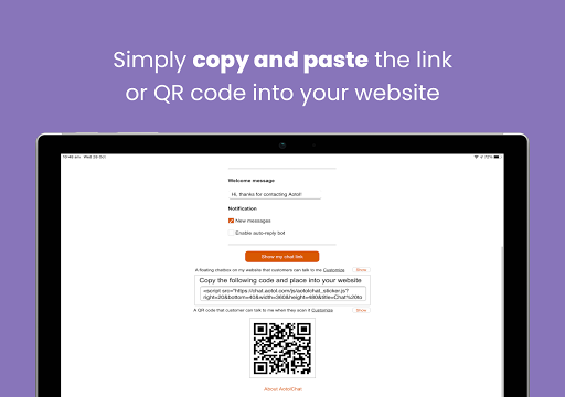1 - Semplice: è sufficiente copiare e incollare il collegamento nell'intestazione HTML o nel piè di pagina del tuo sito web per vedere la chatbox flottante.In alternativa, puoi anche caricare un'immagine del codice QR sul tuo sito web per consentire ai clienti di chattare con te quando lo esegue la scansione.