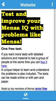 Test your Mensa IQ with free realistic Mensa problems. Learn how to solve the problems with an IQ test and a Helper to learn how the problems are constructed. 15 minutes training a day will greatly improve your test result.