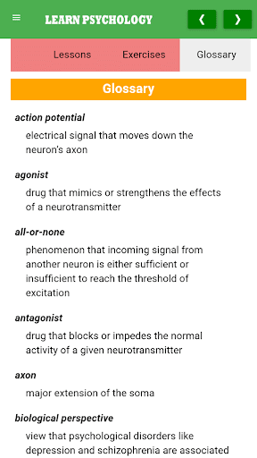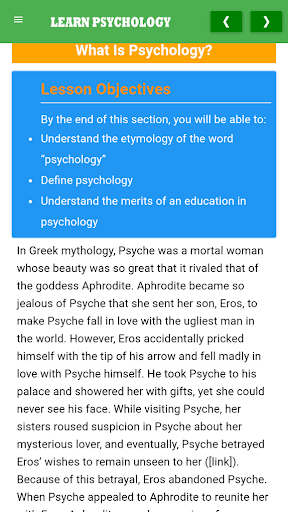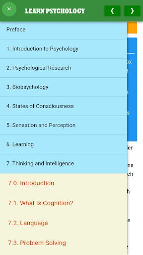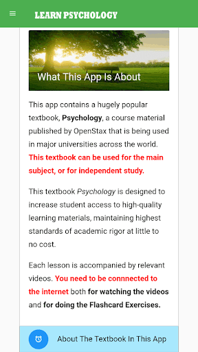 The app, Learn Psychology, contains a Digital Textbook with content such as: