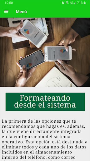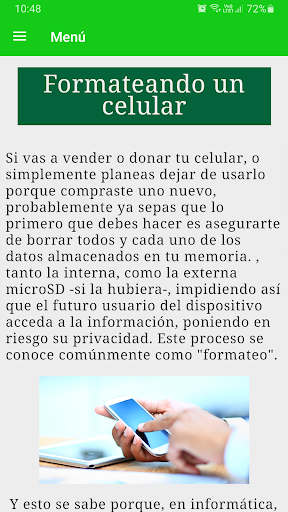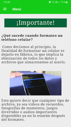 L'app & quot; come formattare un telefono & quot;Ti do un istruttivo spagnolo che ti porta passo dopo passo attraverso la formattazione del tuo smartphone, in modo da evitare di fare un brutto passo che ti fa perdere informazioni preziose.Qui ci sono suggerimenti sulle migliori applicazioni per formattare i telefoni cellulari e con pochi clic puoi imparare a farlo in modo corretto e semplice.