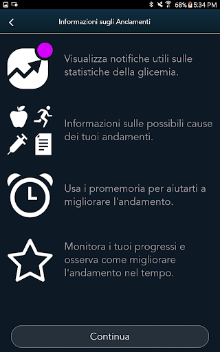 • Andamenti – Può inviarti una notifica sugli andamenti dei risultati della tua glicemia, presentandoti le possibili cause e una guida su come migliorare