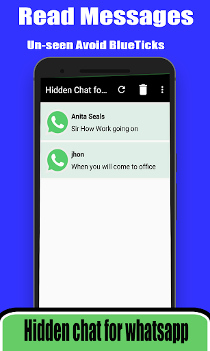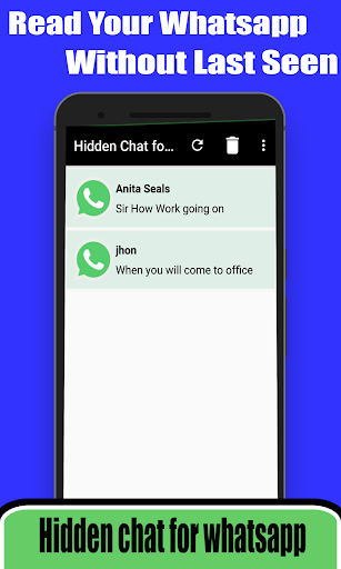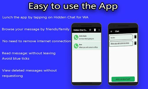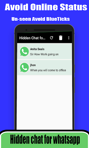 Hidden Chat for WhatsApp is a simple application to read your incoming WhatsApp messages and sending messages without appearing online and without showing blue ticks anymore.