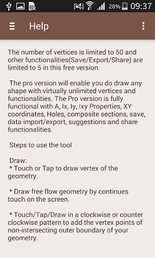 The number of vertices is limited to 14 and functionalities (open, save, import, export, share) are limited to 5 in this free version. The Pro version will enable you do draw any shape with virtually unlimited vertices and functionalities. The Pro version is fully functional with A, V, m, Ixx, Iyy, Ixy Properties, XY coordinates, Holes, composite sections, save, data import/export, suggestions and share functionalities.