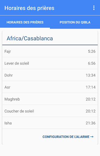 - Displays hours for Fajr, Sunrise, Dohr, Asr, Maghrib, sunset, and Isha.