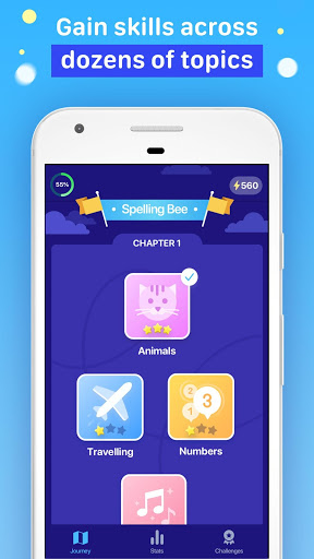 È più di ** 5000 parole ** diviso in argomenti specifici: sport e bellezza, cartoni animati e personaggi famosi, famiglia e corpo umano, ecc. . Questo gioco di ortografia manterrà il tuo coraggio di allenamento con darti premi e monitorando la tua performance.