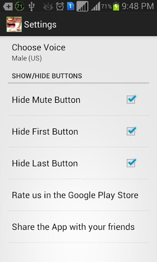 Settings of the app can be used to change different voices, hide/show few easy to maneuver buttons, refer the app to friends.