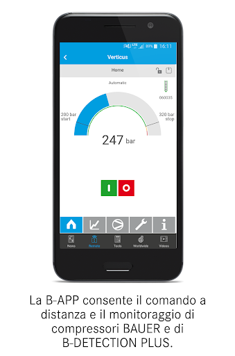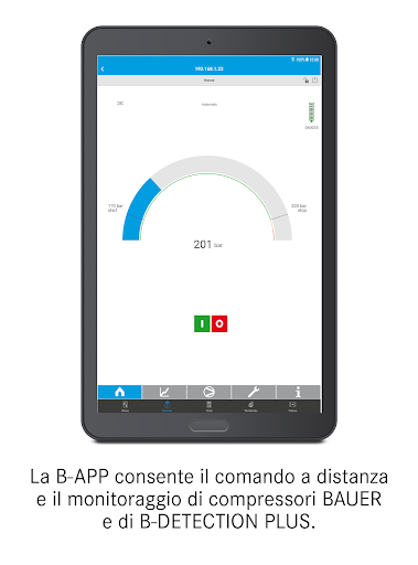 La B-APP consente di monitorare e comandare a distanza i compressori BAUER dotati della nuova unità di controllo BAUER B-CONTROL MICRO attraverso la rete W-LAN locale. Sul proprio smartphone o tablet è possibile, ad esempio, leggere in tempo reale i valori effettivi dei parametri di funzionamento del compressore BAUER o del B-DETECTION PLUS.