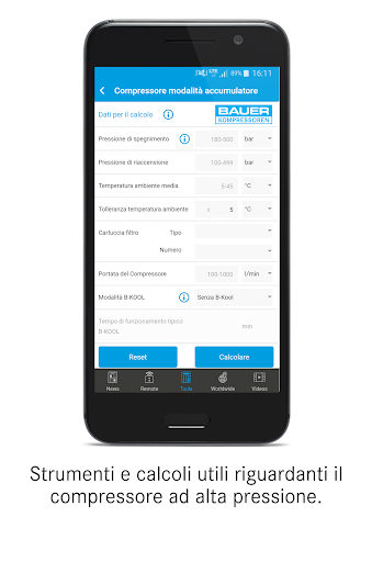 La BAUER KOMPRSESOREN APP (B-APP) offre una serie di funzioni che danno accesso a informazioni specifiche sui prodotti, ai video, alla ricerca dei rivenditori e a utili strumenti di calcolo riguardanti l’aria compressa. Inoltre, la B-APP consente di monitorare e comandare a distanza i compressori BAUER dotati della nuova unità di controllo BAUER B-CONTROL MICRO.