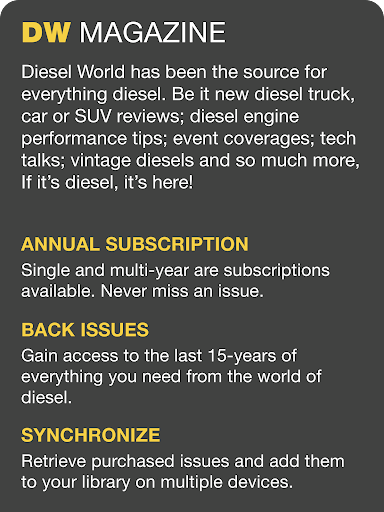 Diesel World Magazine è l'unica pubblicazione automobilistica sul mercato oggi che copre il mercato completo diesel, da motori diesel e notizie di autotrasporti, fino alle ultime auto asilato a diesel. Goditi l'app Diesel World che offre contenuti di Mag Digital in un formato entusiasmante. E mentre le riviste mobili vanno, puoi portare con te la tua rivista Turbo preferita sul dispositivo prescelto con questa app. Diesel World è una risorsa unica per scoprire ciò che è nuovo sul mercato, imparare le nuove parti e gli accessori più caldi e vedere come questi prodotti possono migliorare la tua esperienza di proprietà diesel migliorando potere, chilometraggio e longevità. La rivista offre test su strada approfonditi e valutazioni sulle auto a base di diesel, sia auto che camion, insieme a tutte le ultime notizie su cui i nuovi veicoli diesel stanno arrivando al mercato statunitense e cosa aspettarsi in termini di risparmio di carburante.