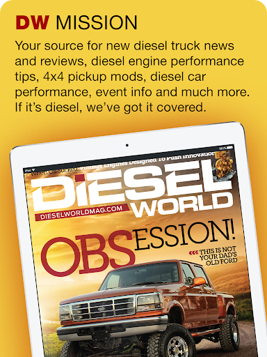 I redattori di Diesel World sono giornalisti automobilistici esperti, che, ogni mese, portano articoli tecnologici approfonditi, spettacolari layout di caratteristiche e una fantastica copertura di eventi del mondo dei motori diesel, che include gare di drag, tirature di slitta e concorsi di dinaming. Sono appassionati pratici che possono rendere anche l'argomento tecnico più difficile in una storia da cui il proprietario del diesel medio può imparare e beneficiare. Con una filosofia di informazione e intrattenimento, i redattori scavano anche in profondità per trovare le insolite e interessanti, come le muscle car alimentate da diesel e strane trapianti di motori diesel.