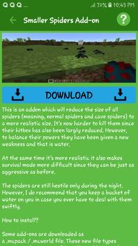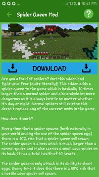 This is a collection of the best spider mods and addons available for Android. These are smaller spiders Add-on, Spider Queen mini game, Spider Queen Mod and Mountable Spider addon. As bonus also included are Pokecraft Mod, Pixelmon PE mod and Bed wars PE mini game, all in one app.