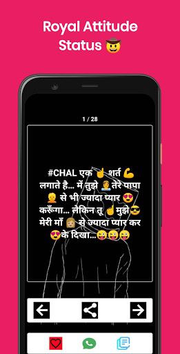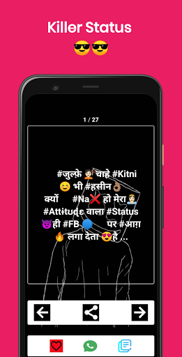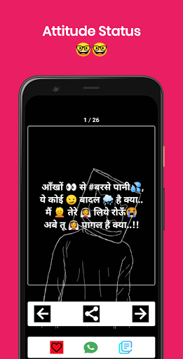 Very easy to use interface just Previous and Next Button to read the best live attitude status in Hindi and easily set that as your WhatsApp status or FB status.