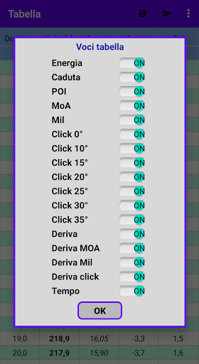 tra le quali anche sei colonne con i click di angolo di sito, da 10° fino 35° con passi di 5°.