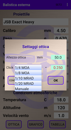Calcola la caduta e deriva del vento di un proiettile e i click in vari angoli di sito.