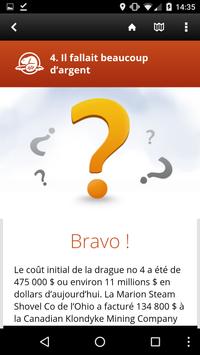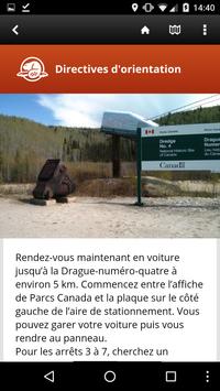 L’application de visite guidée est l’application officielle de Parcs Canada pour visiter le lieu historique national de la Drague-Numéro-Quatre. Vous aurez la possibilité d’effectuer une visite guidée jusqu’à la populaire route de Bonanza Creek, y compris deux lieux historiques nationaux : la drague no 4 et la Concession-de-la-Découverte. L’application vous permettra de découvrir à votre propre rythme le passé, les paysages et les sons associés à ce lieu emblématique. L’application est constituée d’une carte, de photographies, de divers renseignements et de questionnaires qui contribueront à rendre votre visite mémorable, instructive et amusante. Elle est le compagnon idéal pour visiter le Klondike.