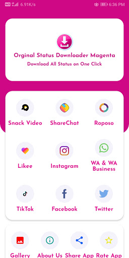 Lo stato originale Downloader Magenta è usato per memorizzare tutti i tipi di stato dei social media.Puoi facilmente salvare tutti i video e immagini su un singolo clic.