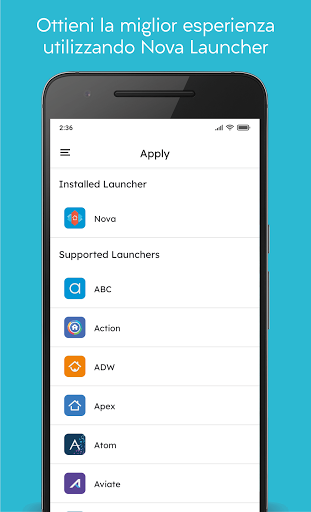 Dal Pixelful Icon Pack è possibile selezionare i seguenti launcher: ABC, Action, ADW, Apex, Atom, Aviate, Evie, GO, Holo, Holo HD, LG Home, Lucid, M, Mini, Next, Nougat, Nova, Smart, Solo, V, ZenUI, Zero.