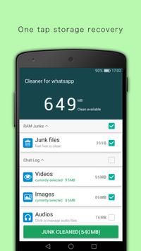 Cleans junk, residual and cache files to free up storage. Boosts speed and improve the performance of your phone. Keep your phone clean and fast with Cleaner for whatsapp.