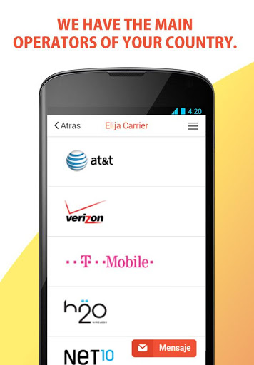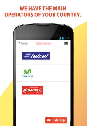 Also recharge phones Claro, Movistar, Cubacel, Tigo, Unefón, Iusacell, AT & T, Unefon, Alo, Nextel, Tigo, Virgin, Claro, Orange, Viva, Personal, OI, Tim, Alive, MTN, Kolbi, Etisalat, Mobinil, Vodafone , Airtel, Verizon, Telcel America, H2O, Net10, UltraMobile, Tracfone, Red Pocket, Cliqa, Easy Go, LycaMobile, Simple Mobile, Spot Mobile, Expresso, Glo, Digicel, Natcom, Aircel, Idea, MTS, Reliance, Tata, Uninor, Videocon, Safaricom, Celcom, Maxis, Inwi, Maroc, Telecom, Meditate, Globe, Smart, Sun, Cell, Zoin, Bmobile, Tunisiana, Telecom Tunisie, Mobile G, Mobifone, Vietnamobile, Viettel, Vinaphone, Econet, Netone and Telecel.