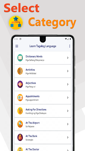 There are many categories in which you can find phrases such as if you want to Know that where is the doctor sitting today than you will find a category (At the Doctor) and in this category, you will find phrases about the doctor. You can easily learn Tagalog if you give 15 Minute a day to this application.