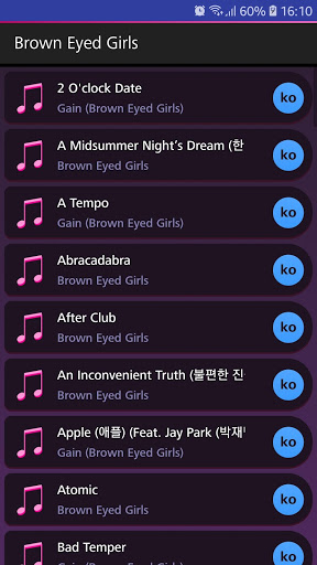 In this application you can find great number of Brown Eyed Girls lyrics. This application does not contain audio or video. It only contains the lyrics, the title and the name of the artist.
