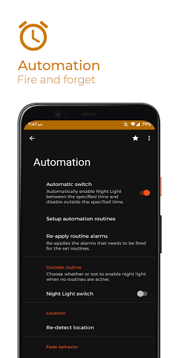 La luce notturna presenta un'interfaccia utente semplice e attraente, che utilizza il meglio di ciò che il design del materiale ha da offrire e fornisce molto facile -Utilizzare l'interfaccia utente. Fornisce una cruscotto ordinato che fornisce un clic di un clic per funzioni comunemente utilizzate. Fornisce anche tema scuro e leggero e personalizzazione dell'icona.