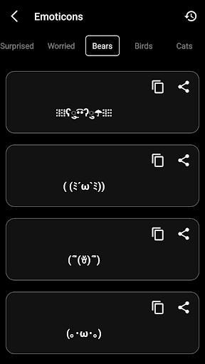Esempi di emoticon: arrabbiato, confuso, eccitato, felice, ferito, amore, triste, spaventato, compiaciuto, sorpreso, preoccupato, orsi, uccelli, gatti, cani, pesci e creature marine, scimmie, maiali, conigli, altri, scusando, piangendo, ballando, rinunciando ...