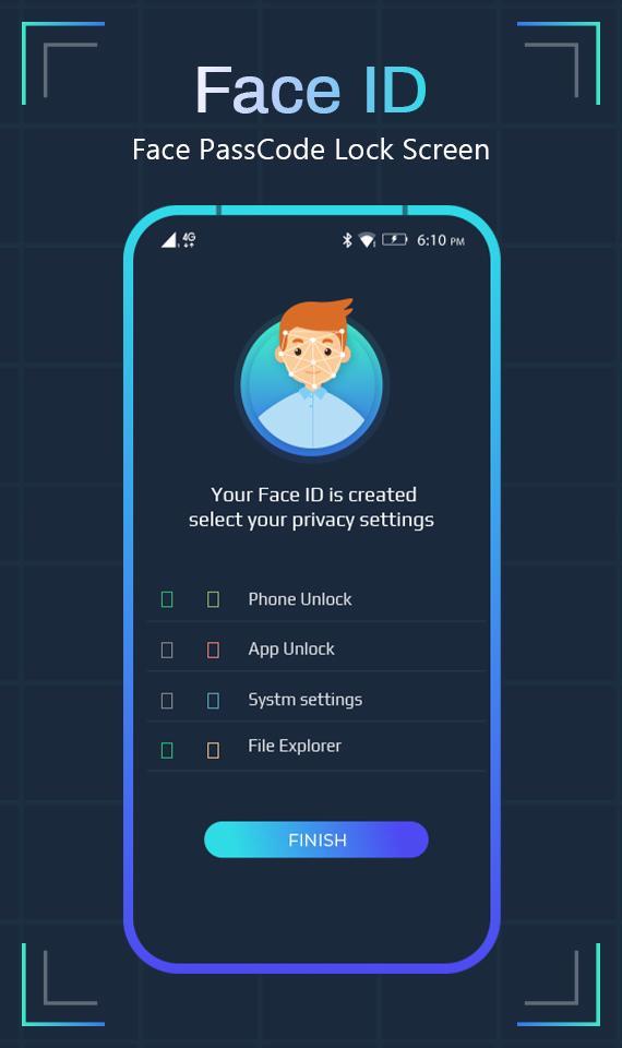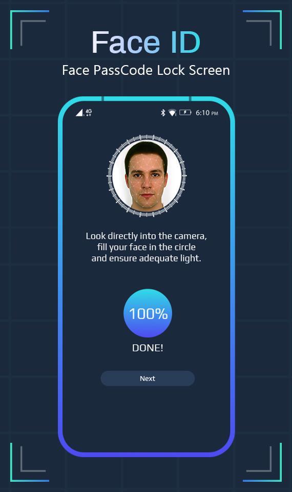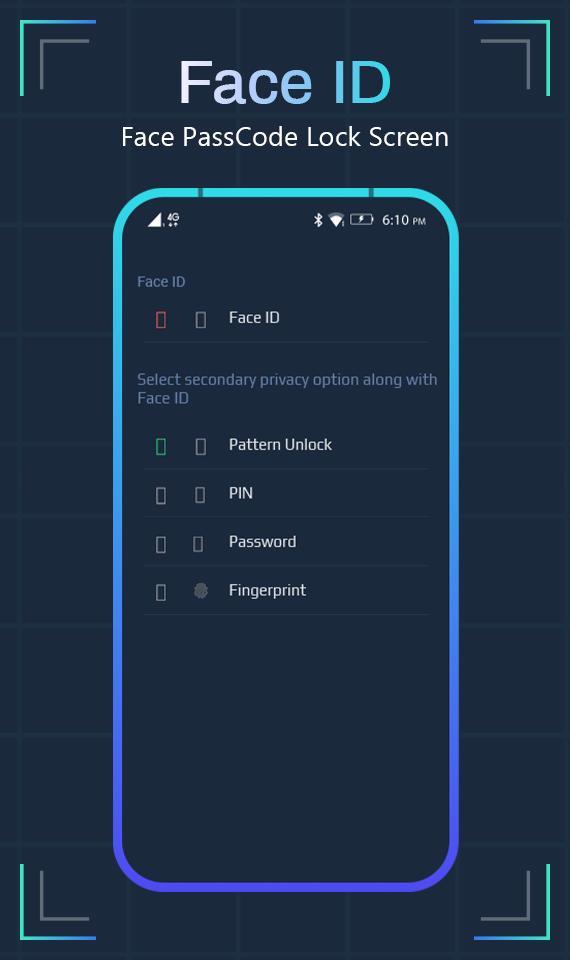 Face PassCode Lock Screen is a special style lock screen for you. When you press finger on screen ,there's a frame that pretend to detect your face, then screen will be unlocked in a second. So please notice that Face PassCode Lock Screen can not really detect your face, it’s not a real Face PassCode App lock & Lock Screen.