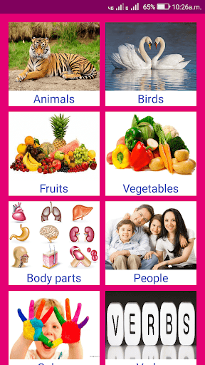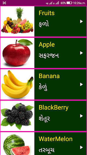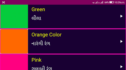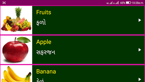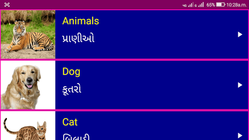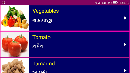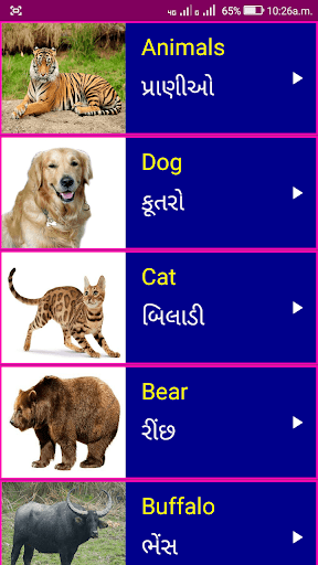 2. English words are provided under many useful categories like animals , birds, fruits , vegetables , colors , people , numbers and sentences to learn important English vocabulary from Gujarati easily.
