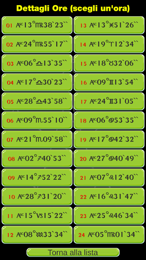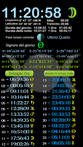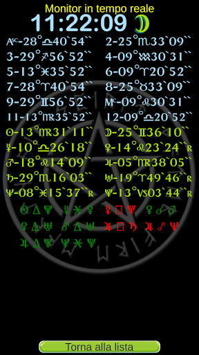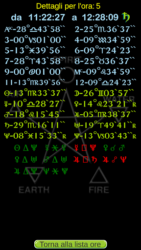 • Carta astrologica e aspetti e posizioni planetarie sia per il monitoraggio in tempo reale che per ogni cuspide dell'ora magica