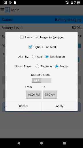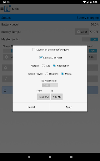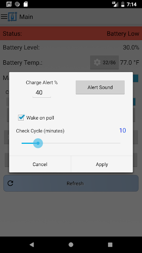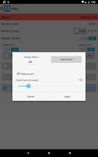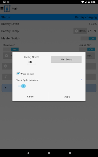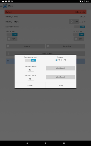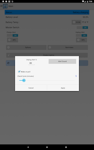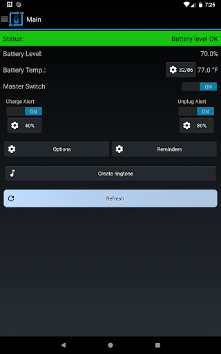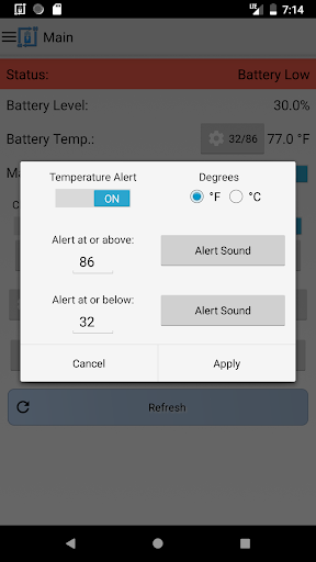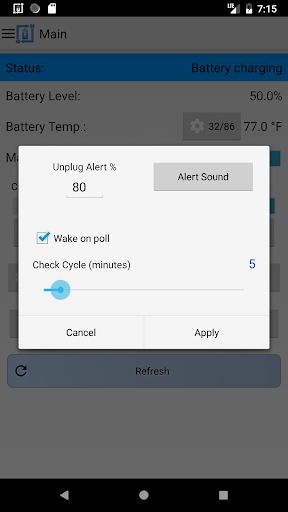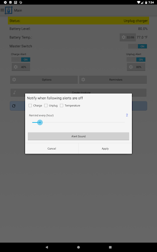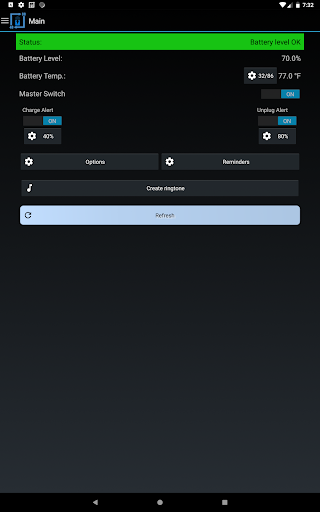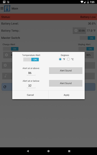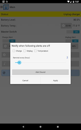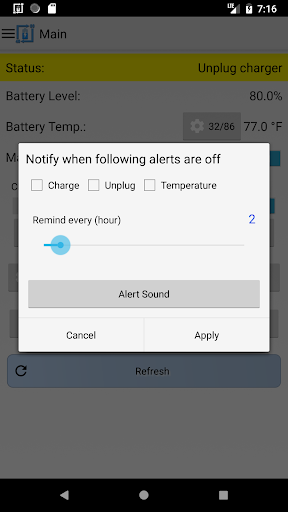 It can also be used for battery full charge repeating alarm by setting unplug alert to 100%. The app also has the capability to provide battery temperature alerts. Keeping the battery at a stable temperature is an important measure in maintaining the overall health of your battery.