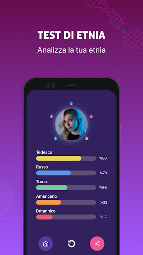 Il modo più divertente e realistico per imparare la tua etnia, analisi del DNA e della generazione, sosia e stima dell'età! DNAlyzer: l'app DNA Ancestry Gradient AI fornisce i risultati dell'analisi del test del DNA più realistici mai sviluppati. L'app Dnalyzer effettua l'analisi della razza e della nazionalità utilizzando l'IA gradiente. Questa app mette alla prova la tua etnia. DNAlyzer cerca di prevedere il tuo lignaggio e da quale razza provengono le origini della tua famiglia. La tecnologia intelligente del gradiente attraverso la forma etnica artificiale del viso, il colore della pelle, il colore dei capelli, la struttura degli occhi fornisce un'accuratezza ottimale nei risultati considerando le proprietà fisiche della mascella e del viso. Sulla base dei risultati, puoi cogliere un nuovo punto di svolta nella tua vita. Caratteristiche Analizzatore di DNA con intelligenza artificiale a gradiente dove è possibile apprendere il patrimonio genetico grazie all'intelligenza a gradiente inclinato.
