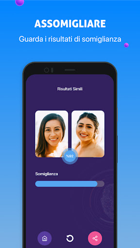 Grazie al supporto per l'analisi del DNA, puoi vedere la somiglianza tra di voi aggiungendo una foto di qualcuno che pensi ti assomigli. Grazie alla funzione Look-Alike, puoi vedere qual è la percentuale della tua somiglianza. La nostra funzione di analisi del DNA esamina la somiglianza della forma del viso, del colore della pelle, della struttura della mascella, del colore e della forma degli occhi e calcola la somiglianza reciproca con l'aiuto dell'intelligenza artificiale nel modo più accurato. Grazie alla funzione Look-Alike, puoi anche scoprire quanto sei simile a una celebrità che ami e il tuo tasso di somiglianza.