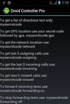 Droid Controller Free is a simple free text based phone location app. If you forget your phone somewhere, or if it is lost or stolen, you can use any phone with texting to have network(needs 3 nearby towers to be accurate) or GPS locations texted back(these location features must be enabled and the app must be setup). The pro version also enables you to retrieve call information and forward all incoming texts to a specific number or you can remotely enable forwarding in case of a lost phone. Uses no battery until you request a location.