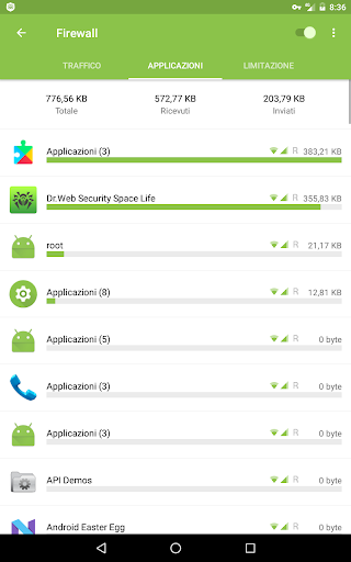 • Monitoraggio del traffico corrente e già trasmesso con informazioni sugli indirizzi/le porte a cui si connettono le app e sulle dimensioni del traffico in arrivo e in uscita;